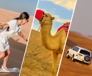 Immerse yourself in an exhilarating experience in the stunning desert landscapes of Dubai. Hang on tight as you embark on a heart-pumping adventure with a dune bashing ride aboard a 4×4 vehicle. Feel the adrenaline rush as you navigate the beautiful dunes. Stop at a picturesque location and capture stunning photos as the sun sets over the wondrous landscape. Drive to the Bedouin camp and be welcomed with Arabic coffee, tea, and dates, as is customary. Enjoy the numerous activities at the camp, like camel riding and sandboarding. Get a henna tattoo and take photos with a falcon while wearing traditional Arabic clothing.